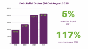 - There were 7,395 breathing spaces registered under the Debt Respite Scheme in August 2025. This is 2% higher than in August 2024. Of the 7,395 breathing space registrations, 7,290 were Standard breathing space registrations and 105 were Mental Health breathing space registrations. Between the start of the scheme in May 2021 and 31 August 2025, StepChange Debt Charity registered 60% of breathing spaces.