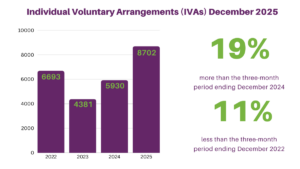 • DRO numbers in December 2025 were slightly lower than the record high seen in August 2025. Numbers of IVAs in November and December were affected by a temporary backlog, meaning that IVAs that would otherwise have been registered in November were instead registered in December.